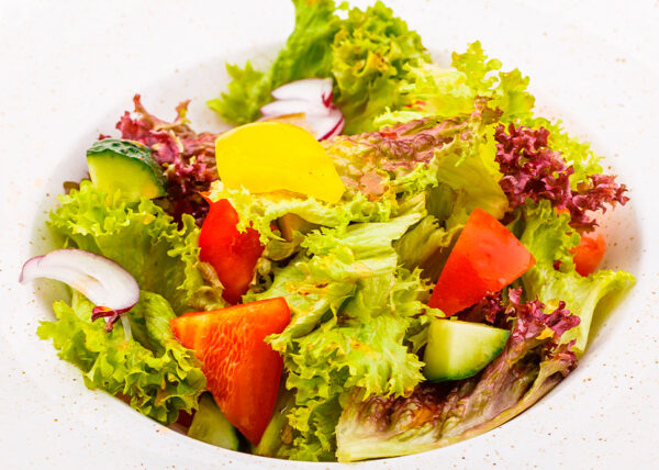 Микс салата, перец болгарский, огурец, помидор, лук ялтинский, заправка из растительного масла.